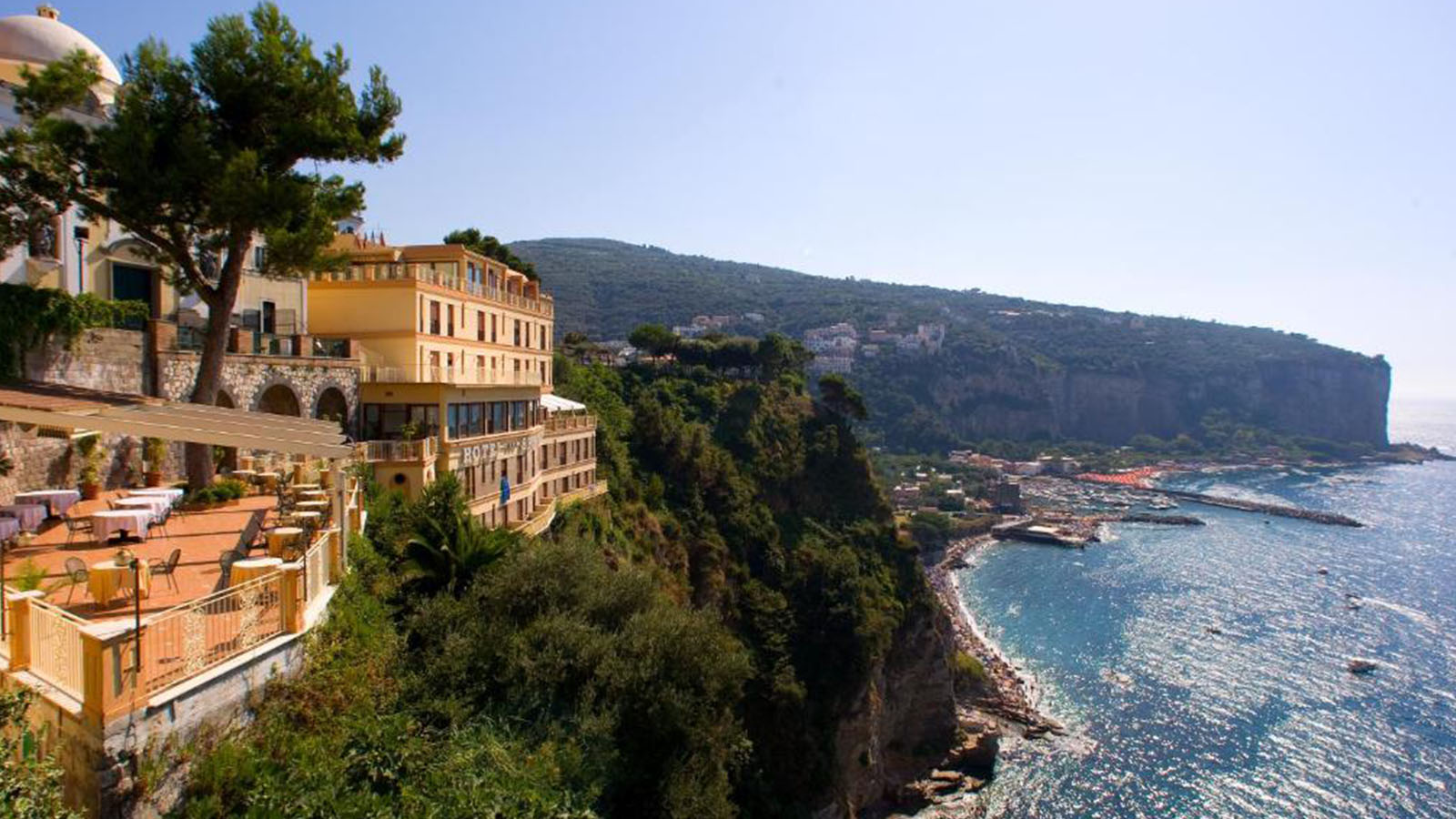 Beläget i innerstadsområde i Vico Equense ca 10 km från Sorrento. Spektakulärt läge med vacker utsikt över Neapelbukten från hotellets restaurang och terrass. Stationen för lokaltåget mellan Neapel och Sorrento (den s k Circumvesuviana-linjen) ligger ca 700 meter från hotellet.