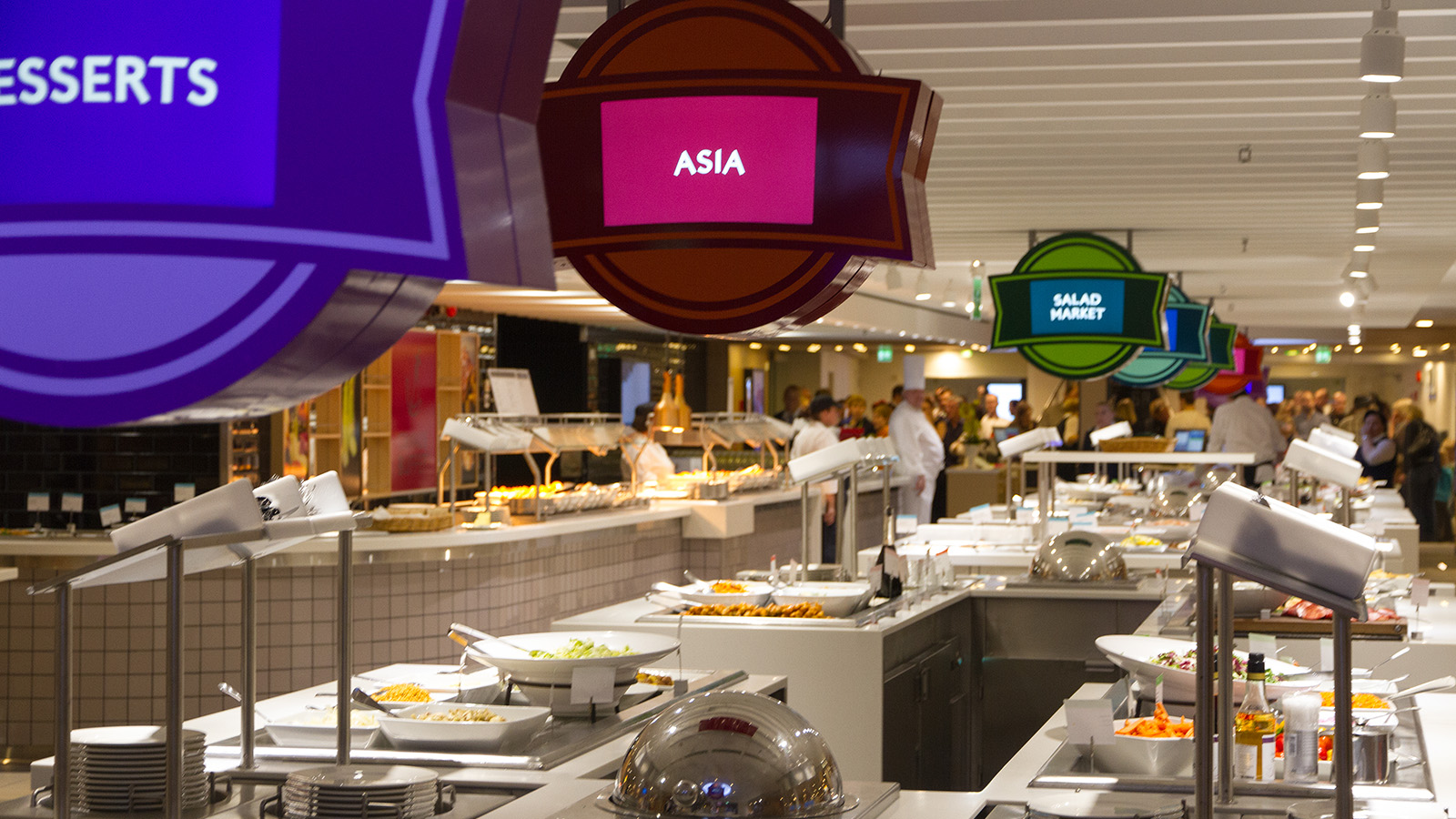 Ombord på fartygen finns flera olika restauranger som serverar läckra rätter för allas smaker. Smörgåsbordet intar vi i ”Grande Buffet”, restaurangen som bjuder på massor av olika rätter och har något för alla smaker. Kalla rätter, kött, fisk och skaldjur men även vegetariskt och veganskt finns att välja på. Efter maten har du ett helt bord av desserter att välja bland. Barn 0-5 år äter gratis i sällskap med betalande vuxen och har ett eget buffébord, barn 6-17 år har rabatterat pris.